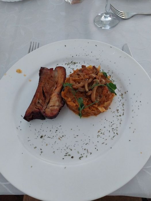 Соковиті свинячі ребра подавали з тушкованою капустою та грибами, а легкий димний аромат, отриманий завдяки спеціальному пристрою Smoking Gun, додав страві сучасного ресторанного звучання.