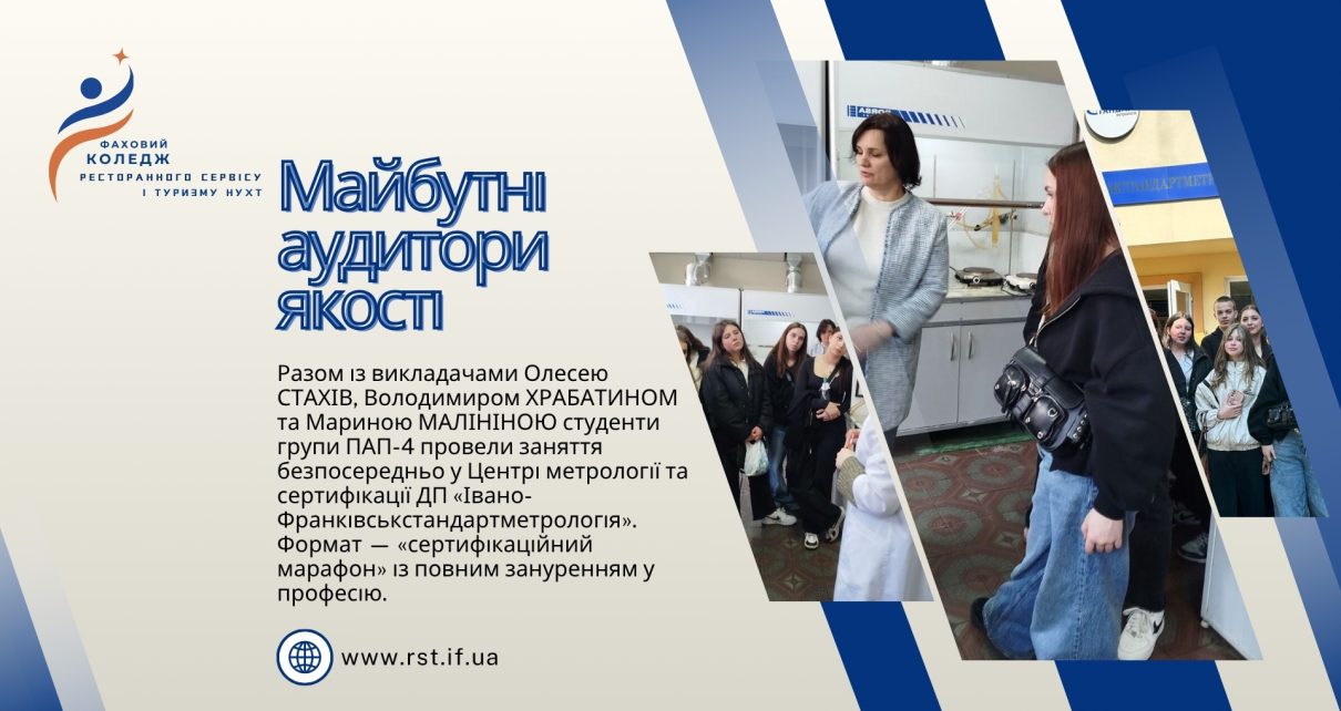 МАЙБУТНІ АУДИТОРИ ЯКОСТІ: ЯК СТУДЕНТИ ПРАЦЮВАЛИ «НА ПЕРЕДОВІЙ» КОНТРОЛЮ ПРОДУКТІВ Хто забезпечує контроль якості та безпеки продуктів у торговельній мережі? Студенти групи ПАП-4 (професія «Продавець продовольчих товарів, агент з постачання») отримали практичне розуміння цієї діяльності під час виїзного заняття. Разом із викладачами Олесею Стахів, Володимиром Храбатином та Мариною Малініною вони відвідали Центр метрології та сертифікації […]