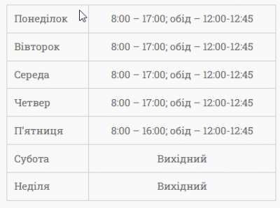 Понеділок 8:00 – 17:00; обід – 12:00-12:45